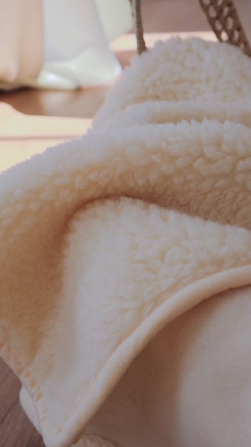 AME babyfilt är tillverkad av 100% ren, kli-fri merinoull. Ena sidan har en mjuk pälssida och den andra en fleece-liknande yta som ger extra komfort. Filten är mjukt kantad och särskilt anpassad för de allra minsta – trygg, naturlig och skonsam mot känslig hud. Storleken gör den perfekt både i vagnen och i babysängen.